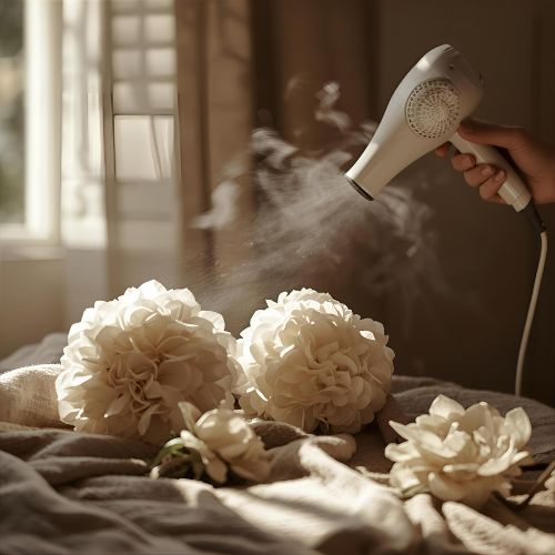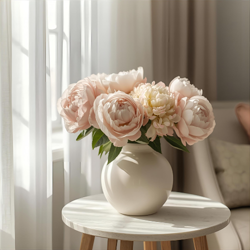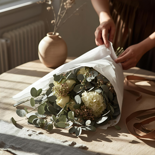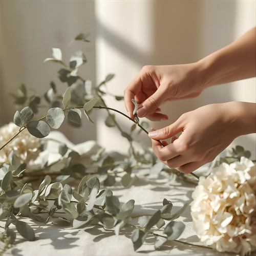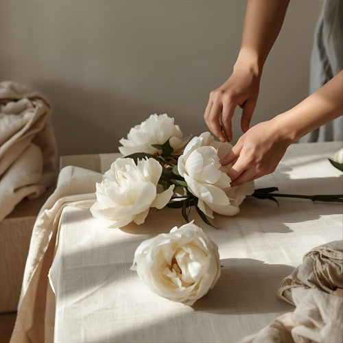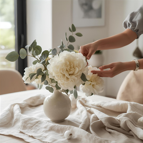 Arrange your stems loosely - think natural, not precise. Mix different textures and heights, letting some blooms sit higher while others lean gently outward. Step back and adjust until it feels calm and balanced.